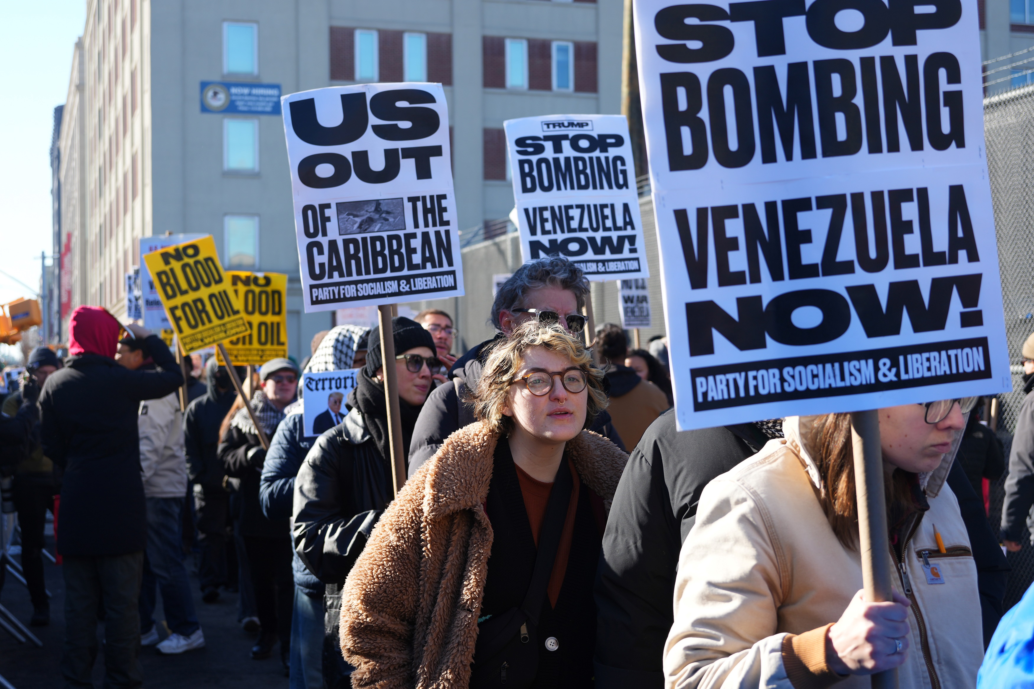 图为示威者4日在拘押马杜罗的纽约大都会拘留中心外举行集会抗议美国对委内瑞拉实施军事打击。(图/中新社)