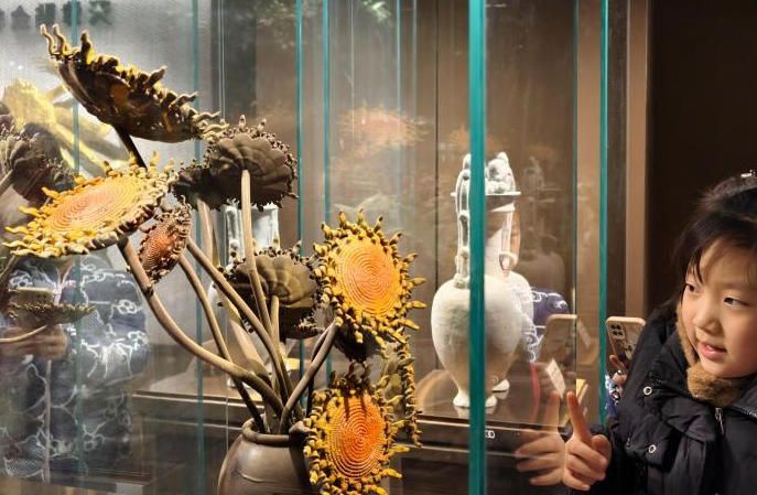 1月2日,天津,市民和游客在巧克力博物馆参观“燃烧的向日葵”雕塑。(中新网)