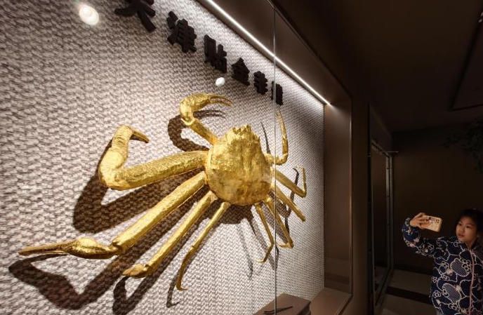 1月2日,天津,市民和游客在巧克力博物馆参观贴金螃蟹雕塑。(中新网)