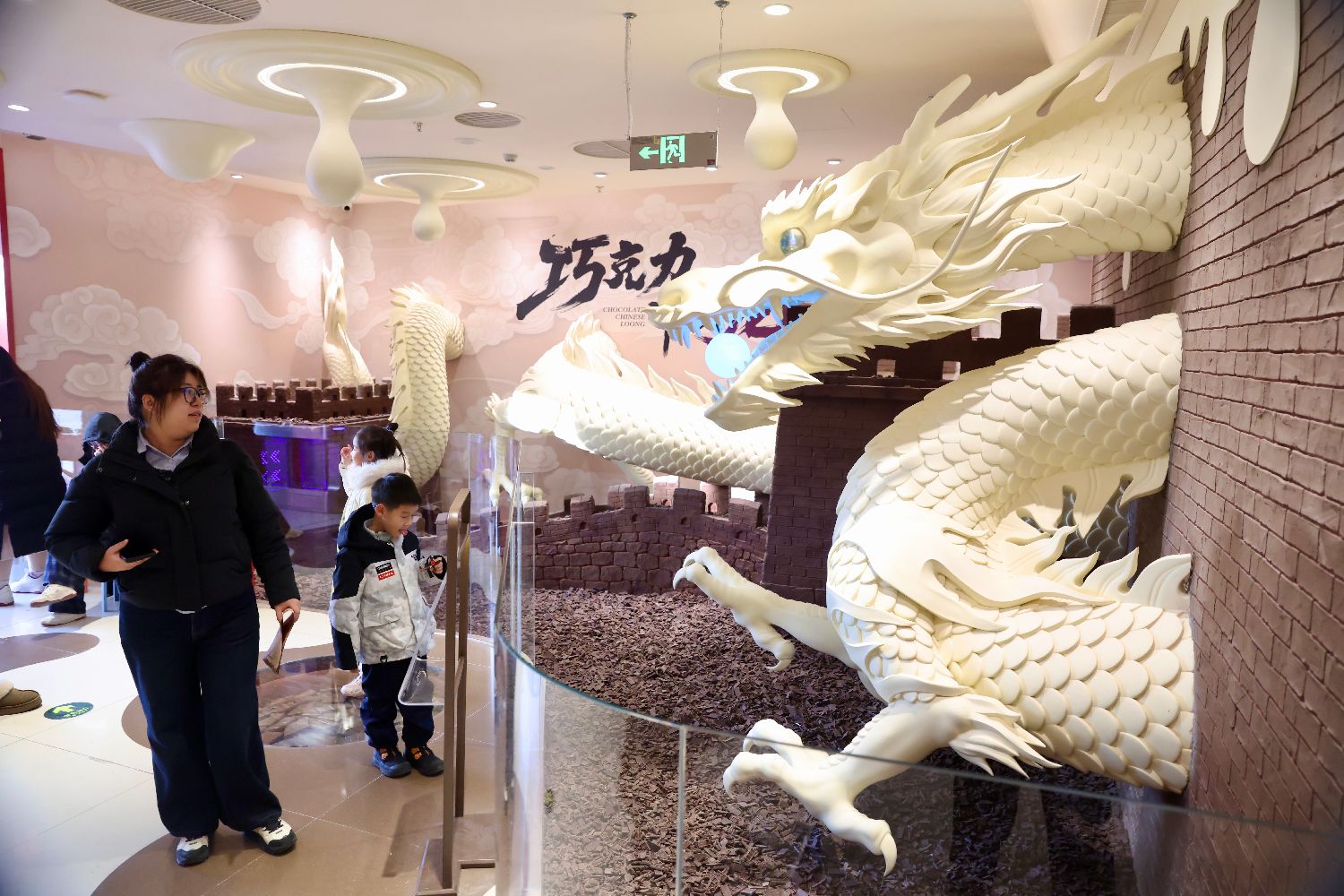 1月4日,市民在北京前门北京坊的巧克力博物馆参观巧克力中国龙。(中新社)