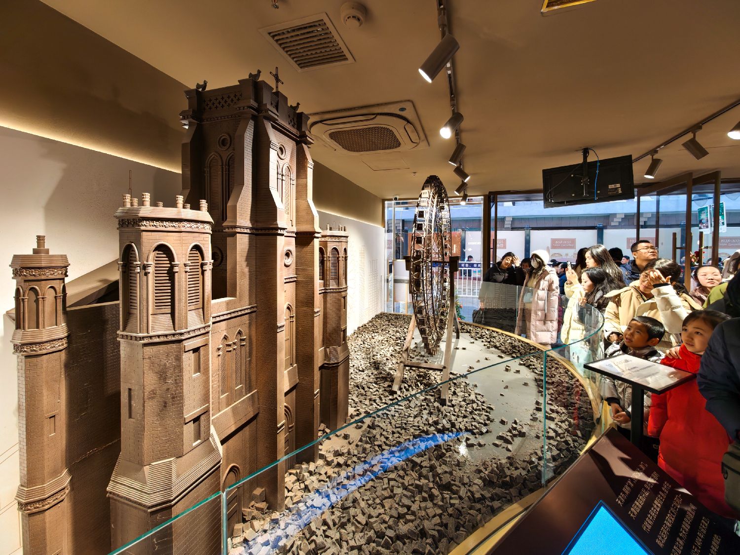 1月2日,天津,市民和游客在巧克力博物馆参观津城地标群雕塑。近日,位于天津和平区金街的巧克力博物馆正式开放,在元旦假期成为热门打卡地。(中新社)
