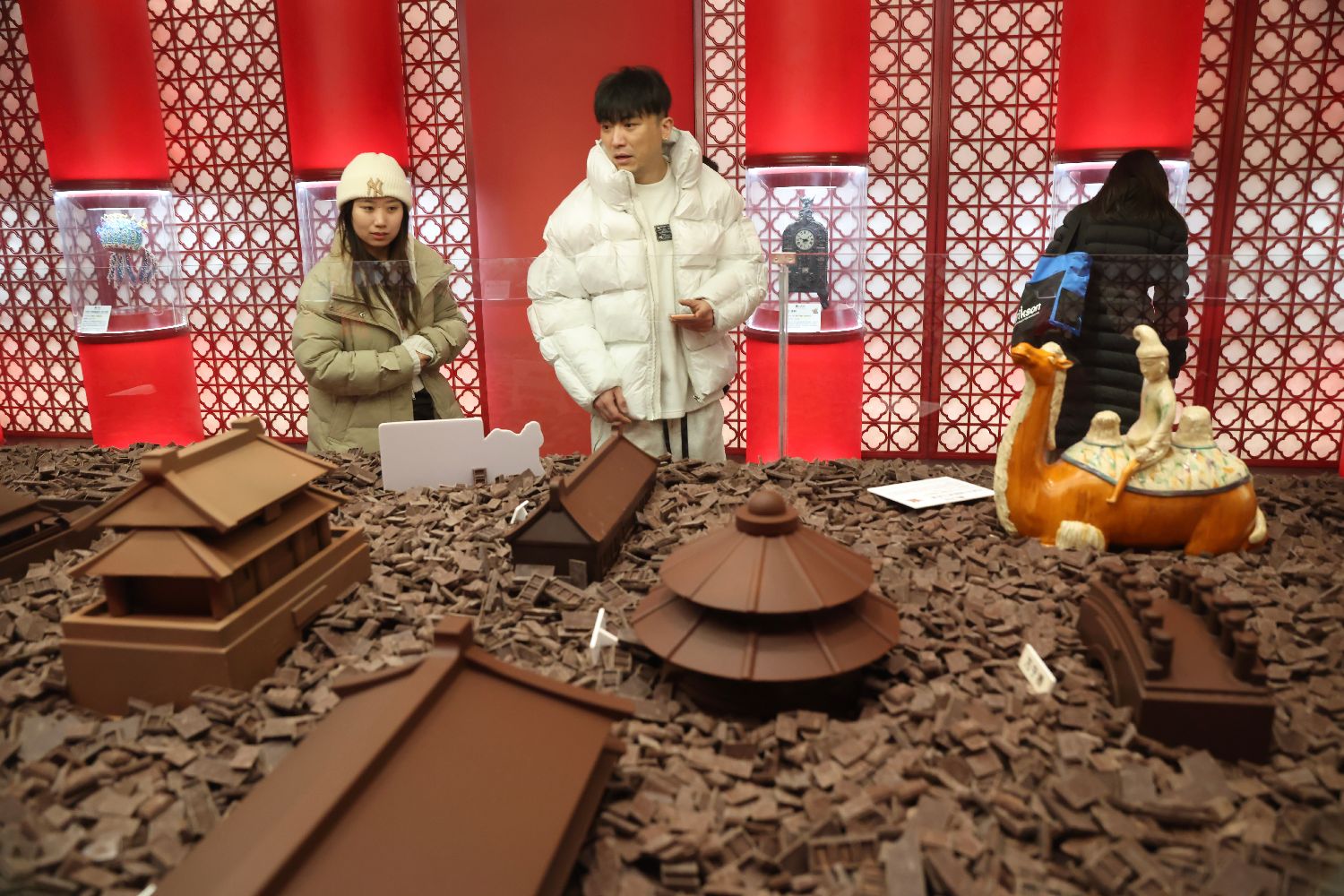 1月4日,市民在北京前门北京坊的巧克力博物馆参观巧克力中轴线古建筑。(中新社)
