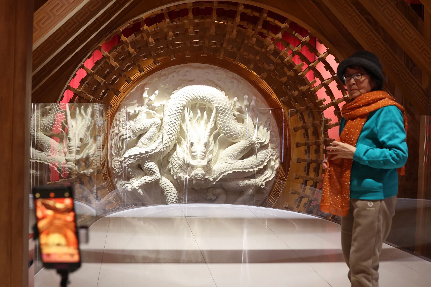 1月4日,位于北京前门北京坊的巧克力博物馆展出的巧克力盘龙藻井。(中新社)