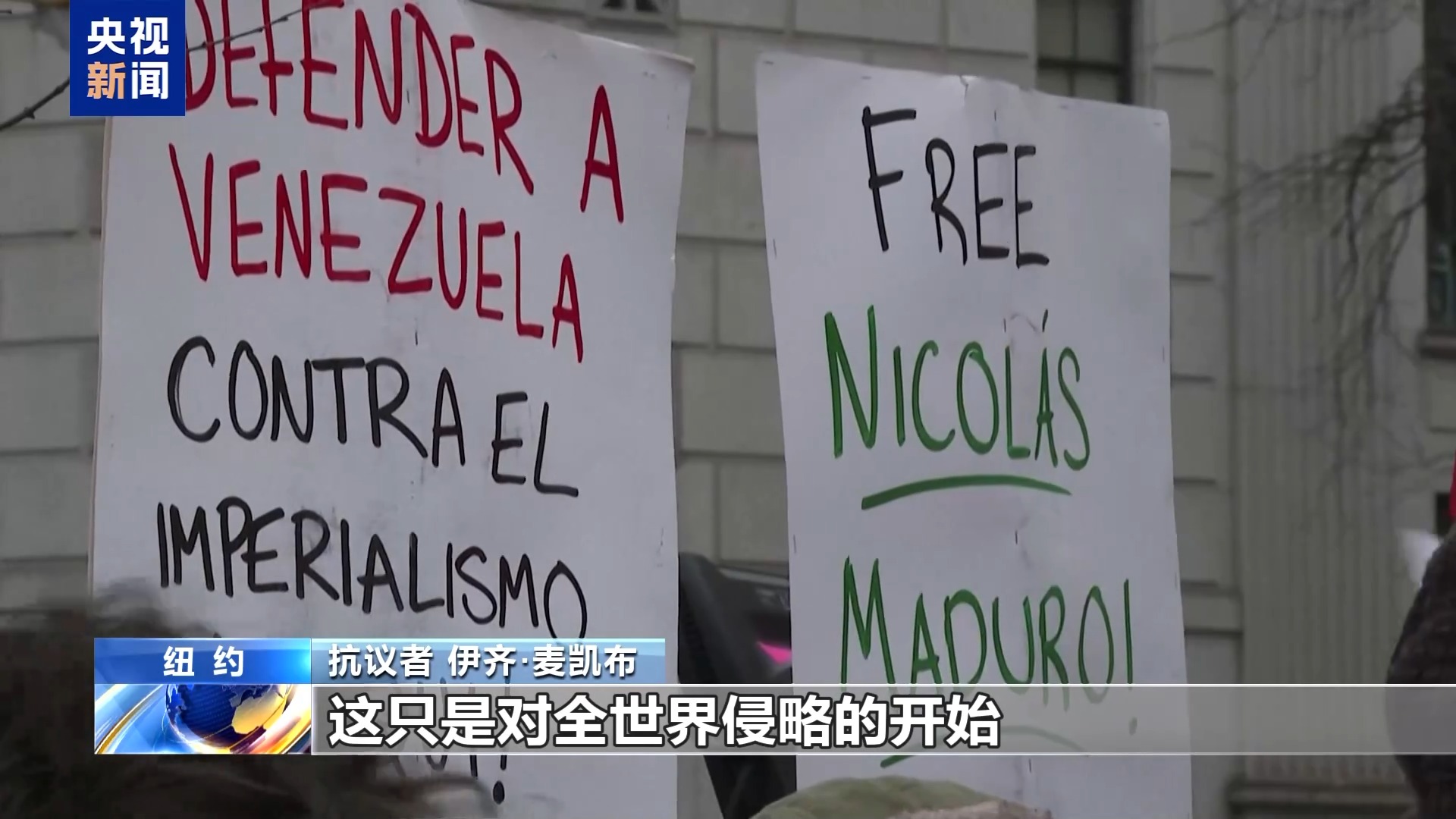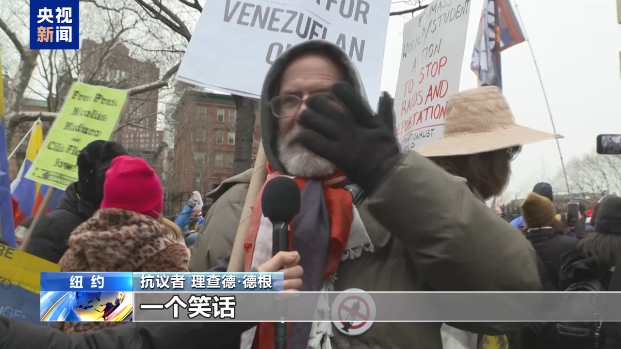 抗议者伊齐·麦凯布:我来这里是要求释放马杜罗总统,并结束美国对委内瑞拉的施压。这是一场政治表演,他之所以被强行控制,是因为他代表着那些拒绝向美帝国主义低头,并在美国施压面前坚持捍卫国家主权的人民。