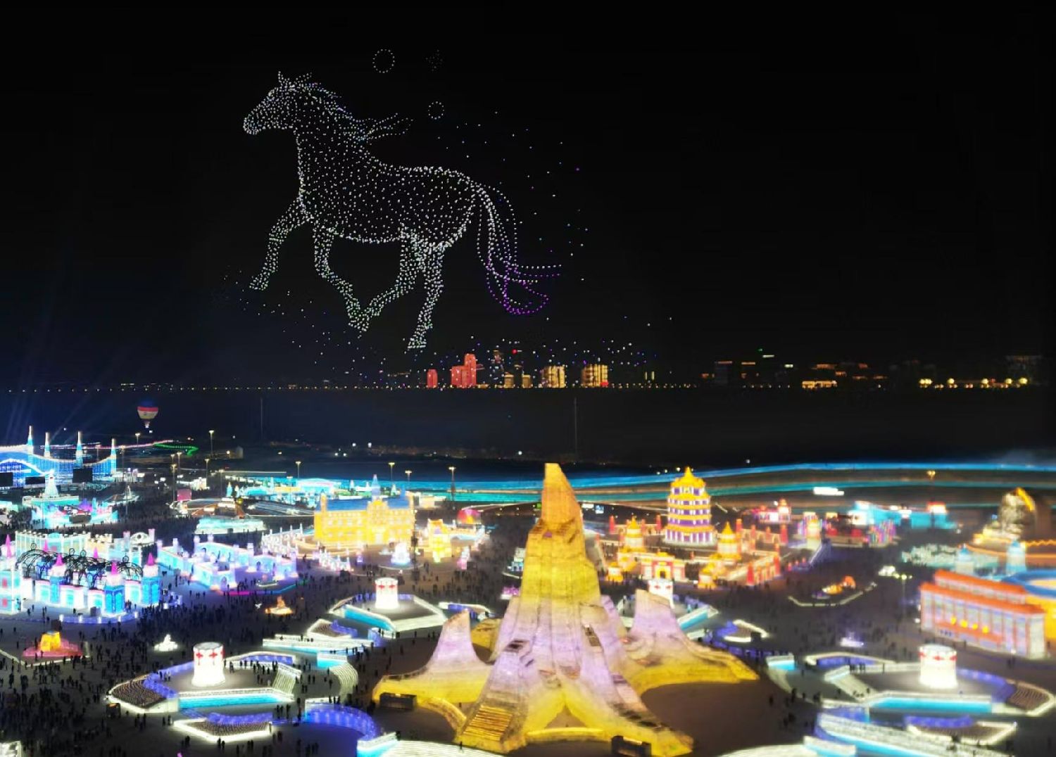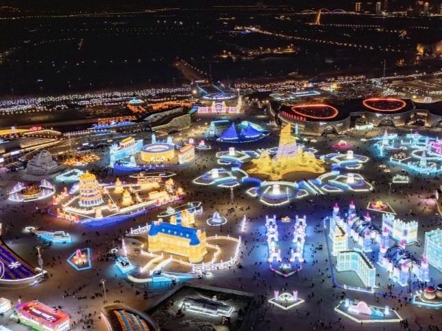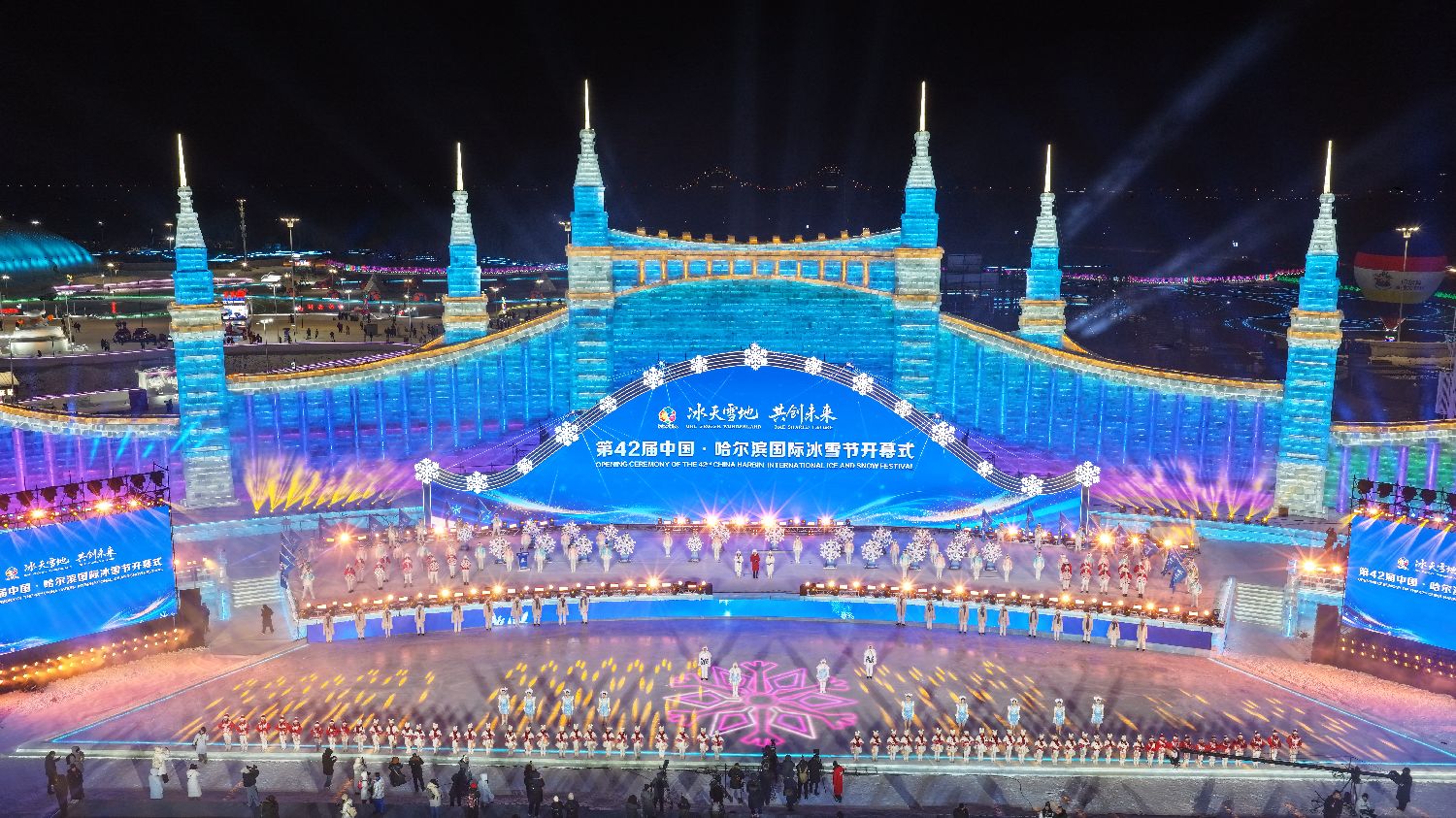 1月5日,黑龙江哈尔滨,第42届中国·哈尔滨国际冰雪节在冰雪大世界开幕。本届冰雪节以“冰天雪地,共创未来”为主题,推出十大冰雪旅游精品线路,举办200余项冰雪文化、体育和经贸活动。作为中国首个以冰雪为主题的国际性节庆活动,哈尔滨国际冰雪节已走过41载春秋,是世界四大冬令盛典之一。图为开幕式现场(无人机照片)。(中新社)