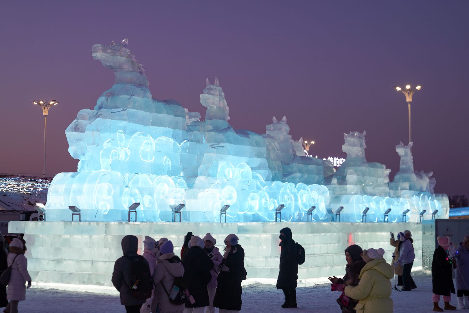 图为游客在冰雪大世界内赏“冰雕马”。(中新社)