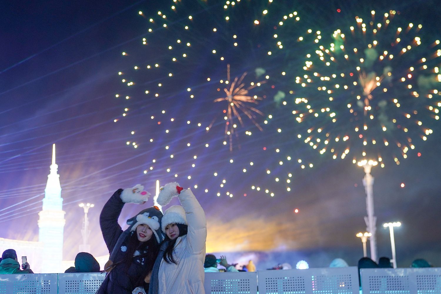 图为燃放焰火庆祝冰雪节开幕。(人民网)