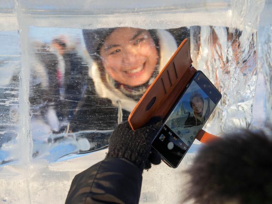 图为游客在哈尔滨冰雪大世界园区透过冰块拍照。(新华社)