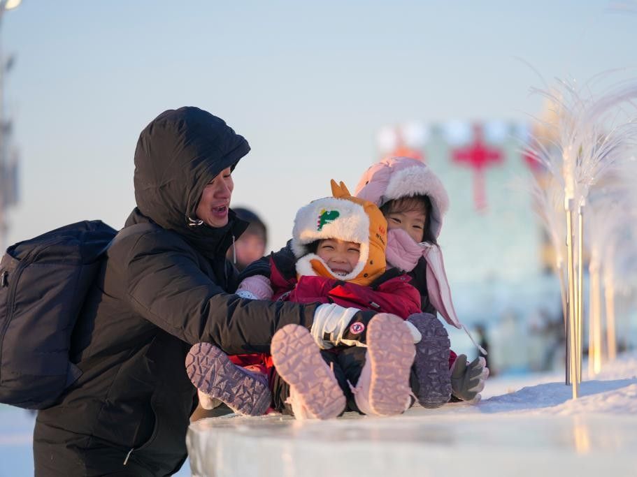 图为游客在哈尔滨冰雪大世界园区玩耍。(新华社)