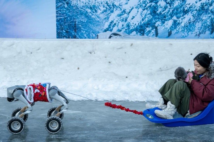 图为游客在哈尔滨冰雪嘉年华园区乘坐机器人拉爬犁。(新华社)