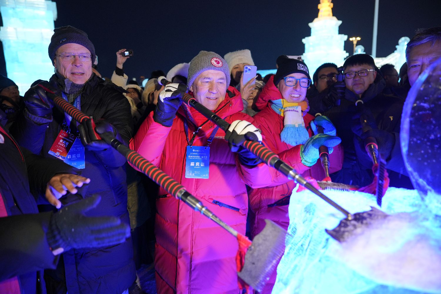 图为与会嘉宾德国马格德堡市政府副市长索斯藤·克罗尔(左一)、芬兰罗瓦涅米市副议长海基·康蒂奥萨洛(左二)、加拿大埃德蒙顿市市长安德鲁·纳克(左三)体验冰雕制作。(图/中新社)