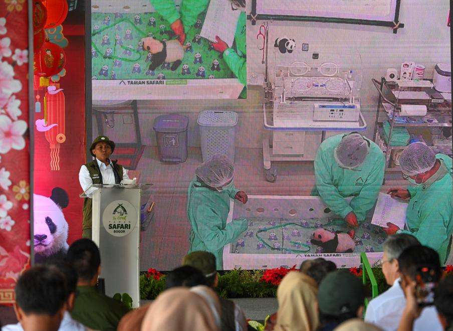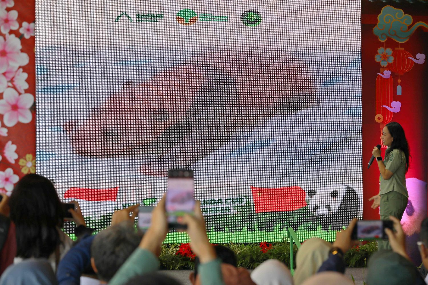 印尼林业部长拉贾·朱利·安东尼6日在现场介绍说,“萨特里奥”意为骑士,象征着勇敢、高贵和品德高尚,“是一个非常美好的名字”,寄托着对大熊猫幼仔健康成长的真挚祝愿。图为当地时间1月6日,在印度尼西亚西爪哇省茂物县的野生动物园,印尼林业部长拉贾·朱利·安东尼向观众介绍大熊猫幼仔“里奥”。(新华社)