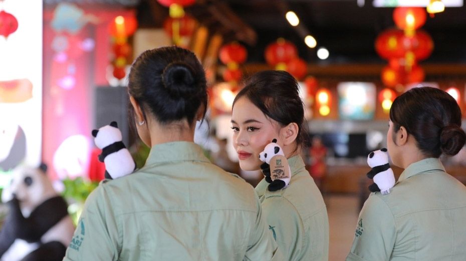 当地时间1月6日,印度尼西亚西爪哇省茂物野生动物园举行“新出生大熊猫幼仔媒体发布会”,现场工作人员肩头别着大熊猫饰品。(中新网)