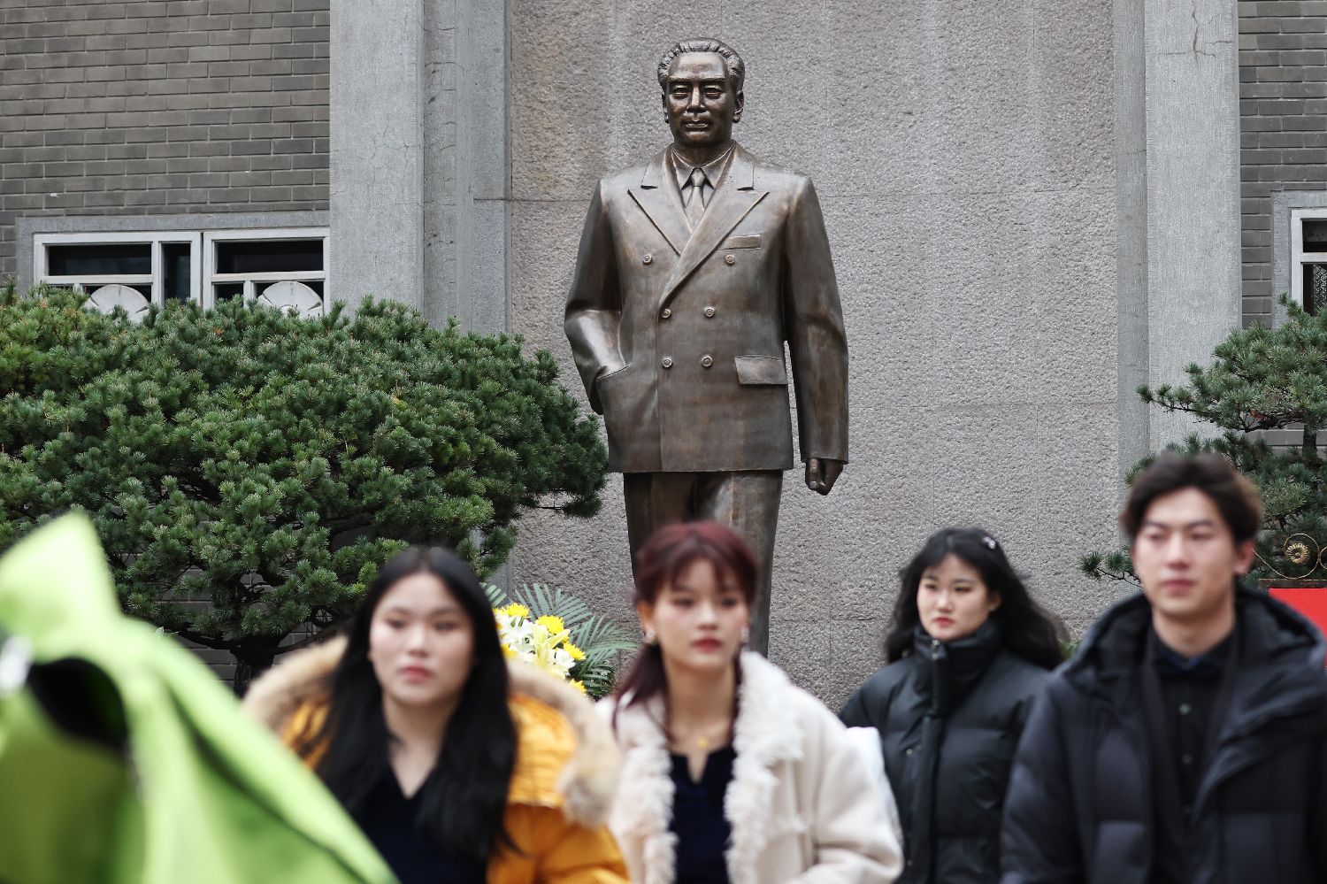 图为参加活动的大学生从周恩来铜像前走过。(图/中新社)