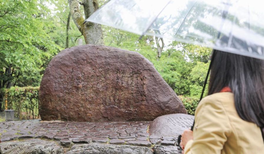 在日本京都岚山,一名游客欣赏“周恩来总理纪念诗碑”。(图/新华社)
