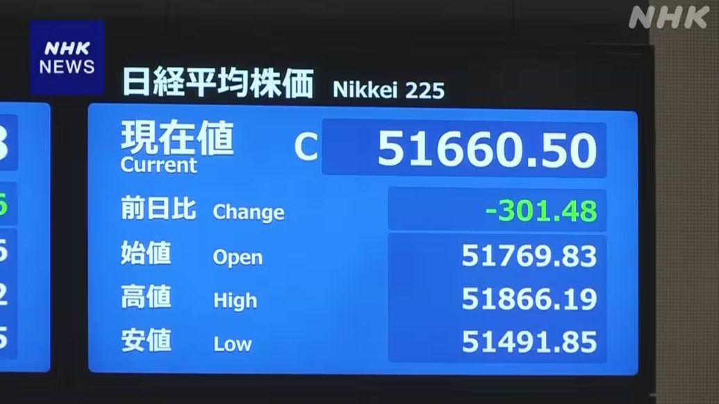 当天上午收盘,日经平均指数较前一交易日下跌301.48点,报51660.50点;东证指数下跌2.96点至3508.38点,上午成交量为11.7亿股。