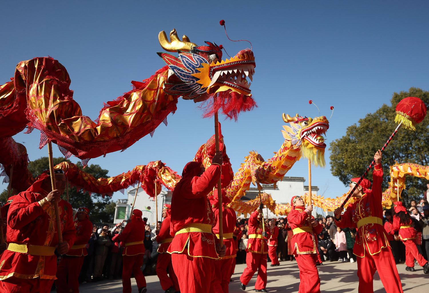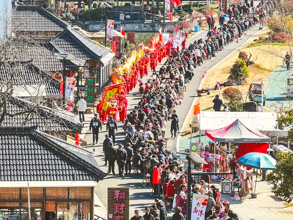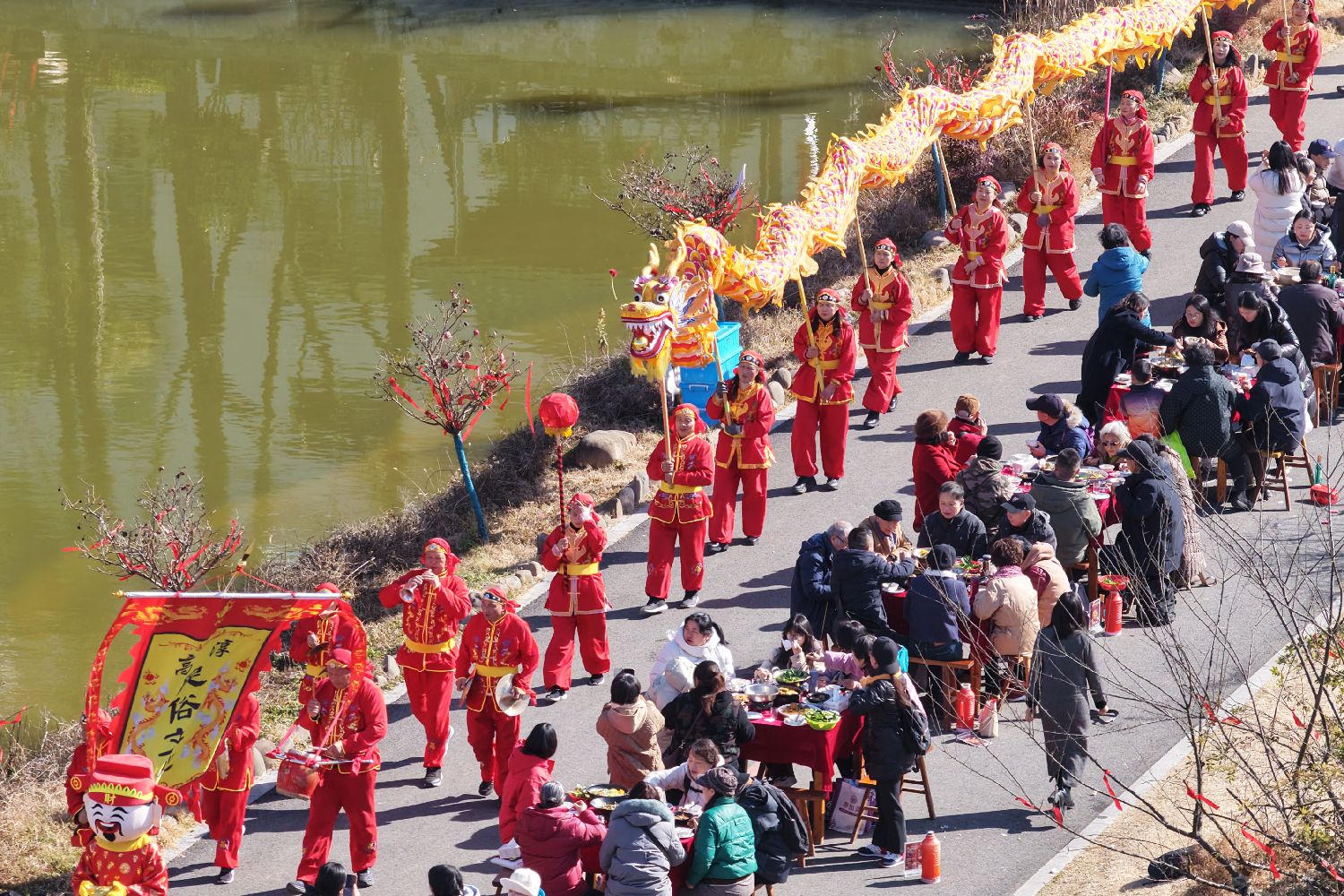 1月11日,江苏南京,高淳桠溪国际慢城长街宴迎来十年之约,这场自2016年启幕的民俗盛宴,在2026年迎来举办第十届的重要节点。本届长街宴不仅延续了往年热闹的民俗氛围,更创下规模之最,450余桌宴席在1600多米的道路上依次排开,特色乡村美食、地道农家味道、民俗表演队伍巡游,洋溢着喜庆氛围。图为村民舞龙队在长街宴上巡游。(中新社)