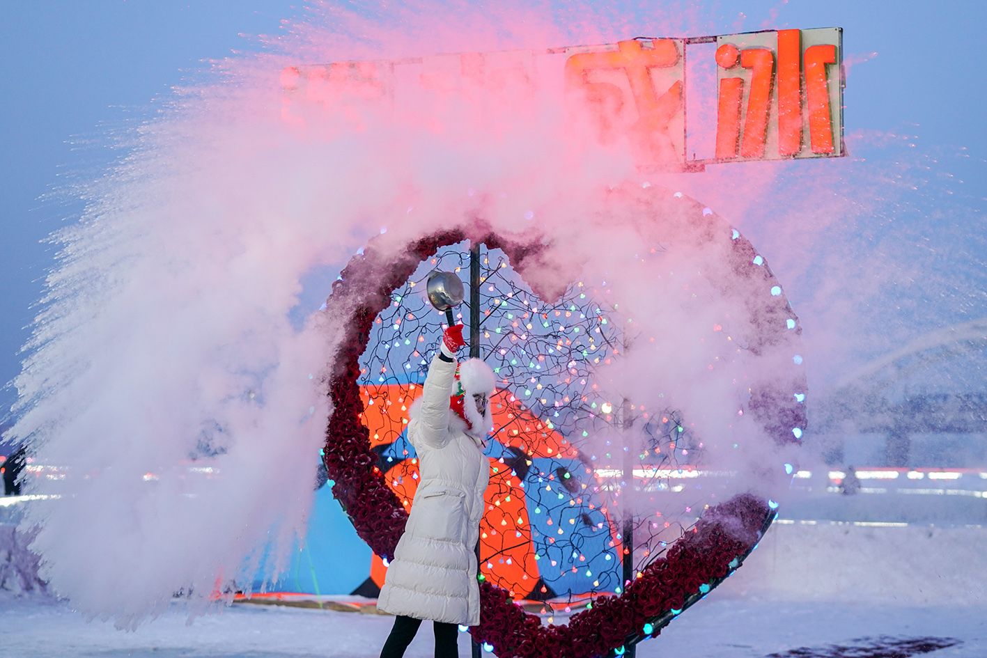 1月11日,黑龙江哈尔滨,游人在松花江冰雪嘉年华体验泼水成冰。当日,哈尔滨天气晴好,市民游客在第八届哈尔滨松花江冰雪嘉年华上体验各类冰雪项目,乐享冰雪之趣。(中新社)