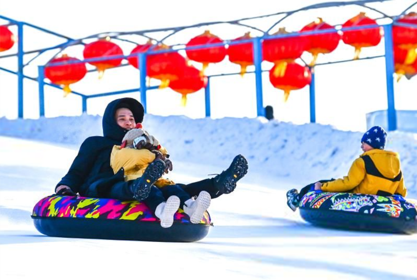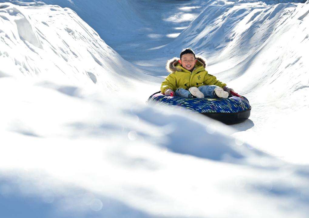 1月11日,游客在呼和浩特市大黑河军事文化乐园内的冰雪乐园里滑雪圈。(中新社)