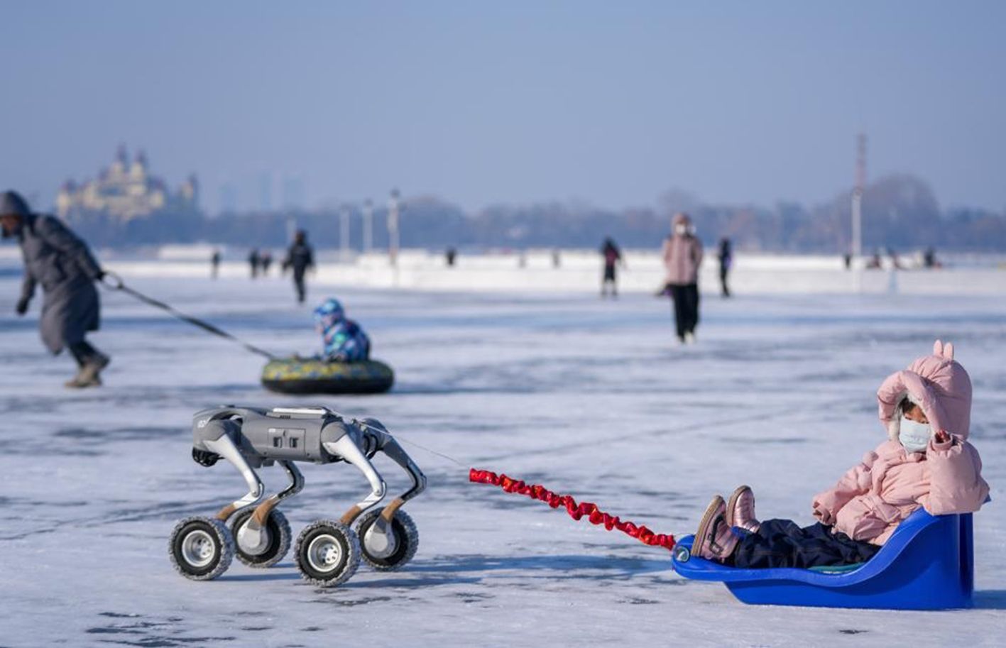 1月11日,小朋友在松花江哈尔滨段江面上体验机器狗拉爬犁。当下,“冰城”哈尔滨市正值冰雪季,冰雪覆盖着的松花江哈尔滨段江面化身为冰雪欢乐场,吸引游客和市民尽享冰雪娱乐运动带来的快乐。(新华社)