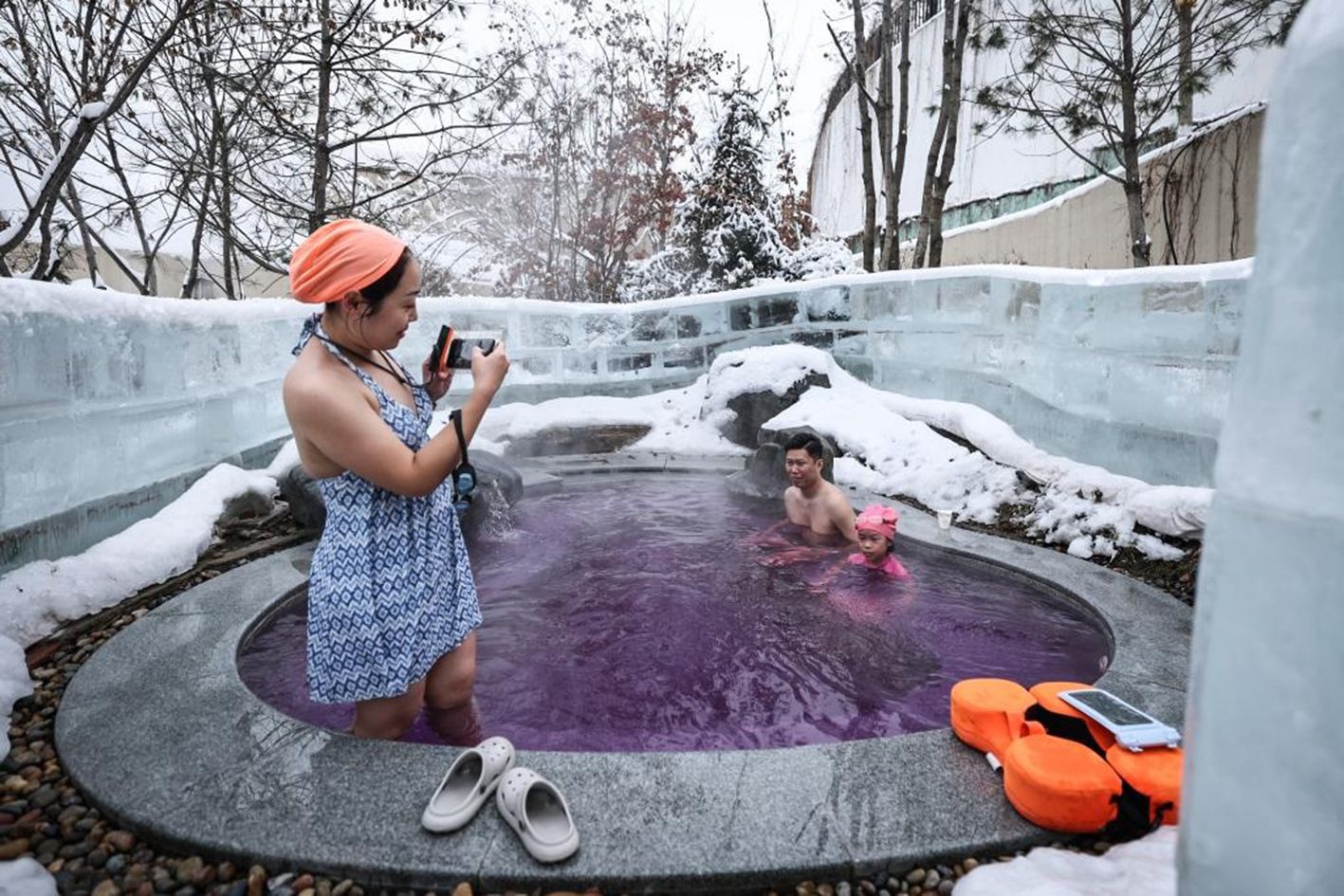 1月9日,游客在沈阳市一家温泉度假酒店体验室外温泉浴。入冬以来,依托得天独厚的冰雪和温泉资源,沈阳推出“冰雪+温泉”系列特色旅游产品,吸引天南地北的游客纷至沓来。(新华社)
