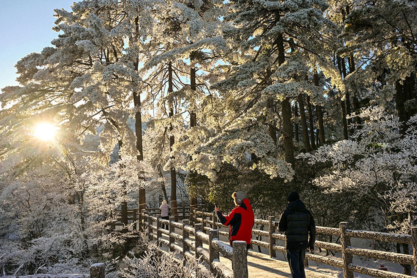 近日,安徽黄山风景区迎来新年首场雾凇景观,漫山银装,玉树琼枝,晶莹的冰晶缀满松梢,吸引游客观赏拍摄。(人民网)