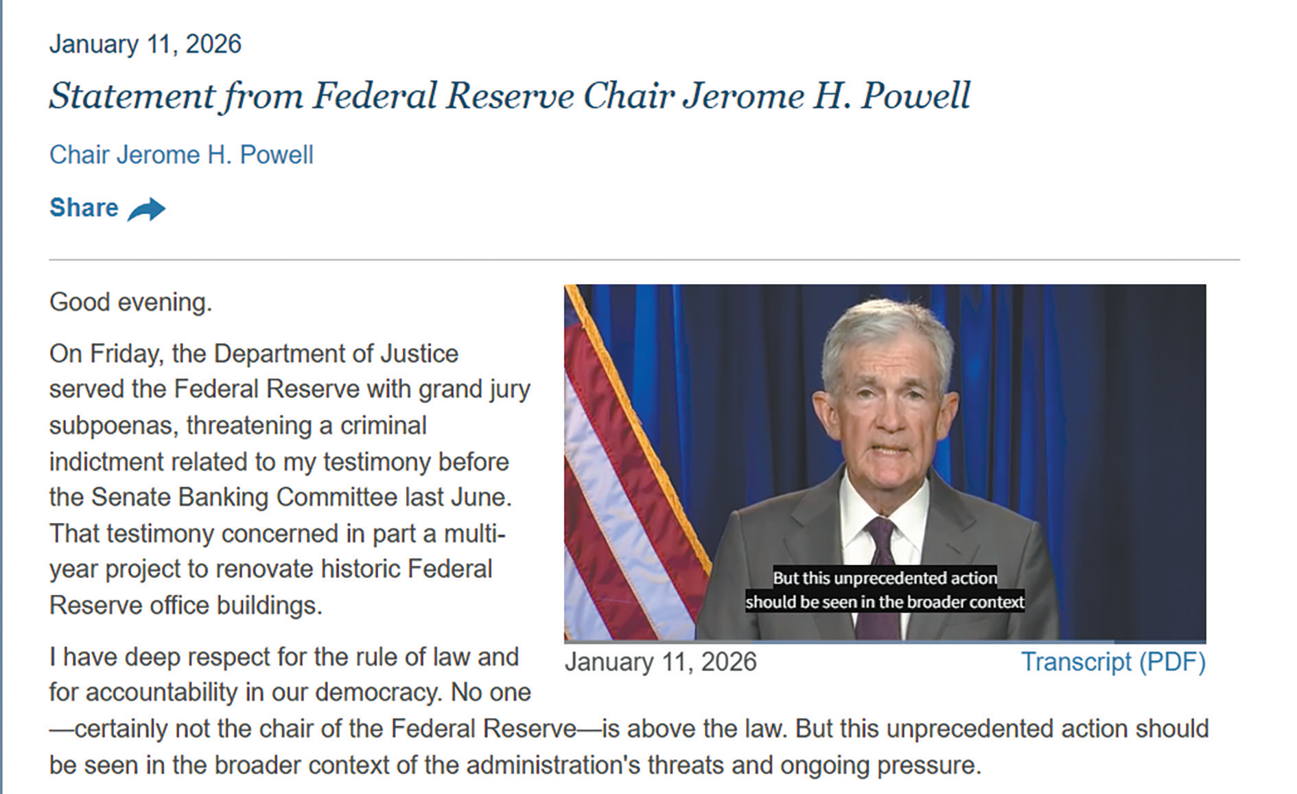 美联储网站11日发布美联储主席鲍威尔的视频及文字声明,回应美政府的刑事调查行动。(美联储网站截图)
