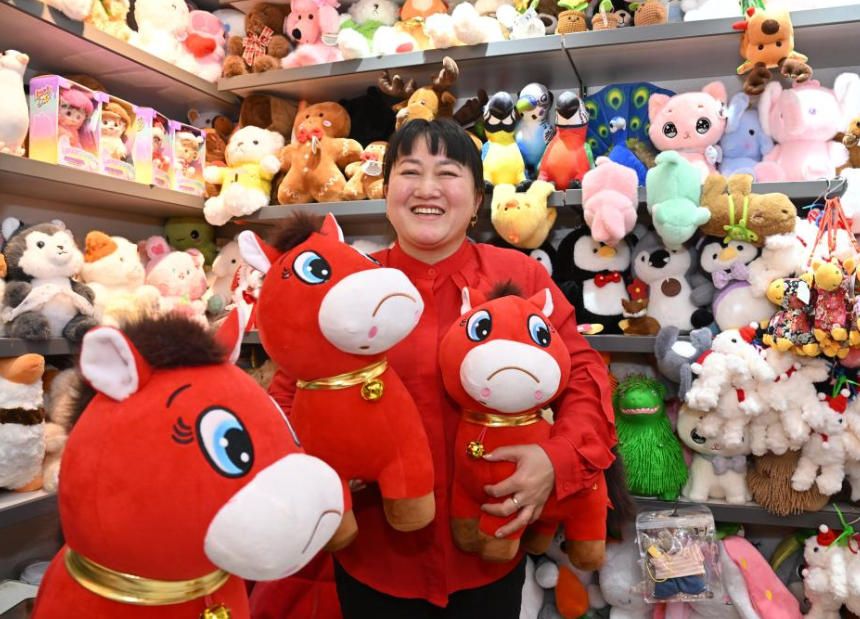 1月11日,浙江义乌商户张火清展示“笑笑马”和“哭哭马”,因订单飞增笑到合不拢嘴。(中新社)