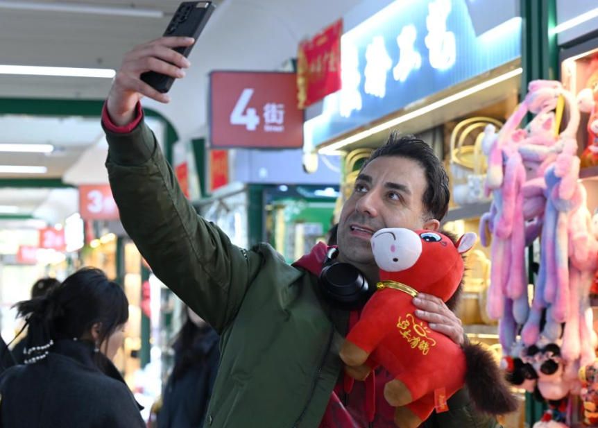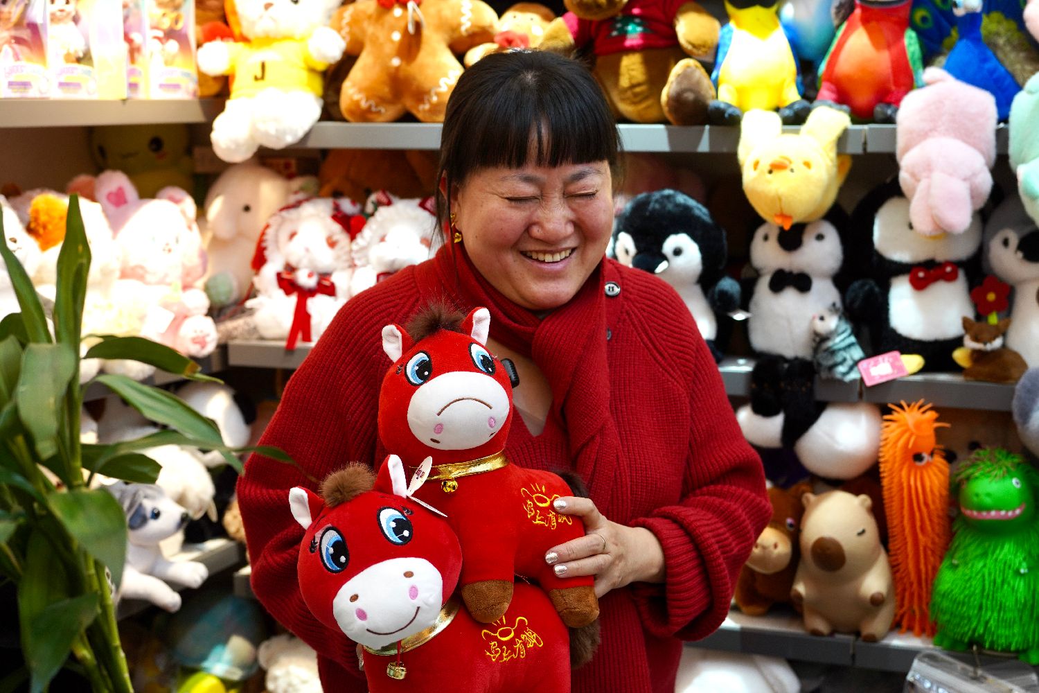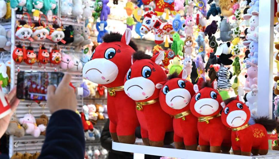 1月11日,采购商估算“哭哭马”尺寸。一位网民近日购入产自浙江义乌的马年毛绒玩具,发现一只次品——其嘴部被缝反,看上去十分委屈。“笑笑马”变成了“哭哭马”,相关话题冲上中国多个社交平台热搜榜,采购订单飞增,商户开了十多条生产线正加紧赶货。(中新社)