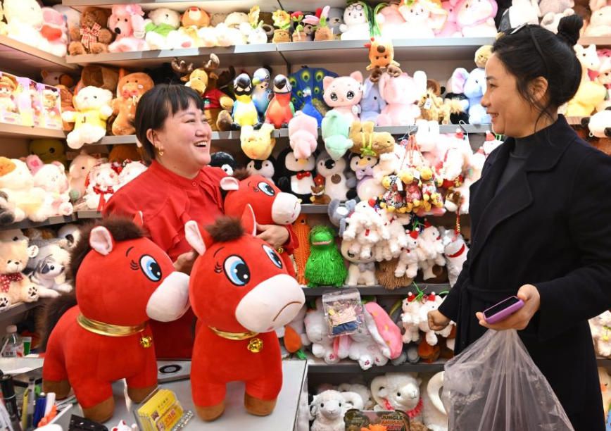 1月12日,在浙江义乌市国际商贸城一区玩具销售区,市场经营户“开心姐妹”负责人张火清(左)接待采购商。(新华网)