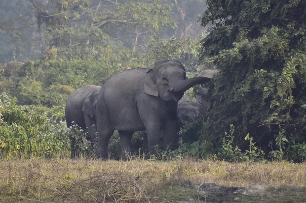 在印度阿萨姆邦,一个野生象群正在寻找食物。外媒2025年12月24日摄