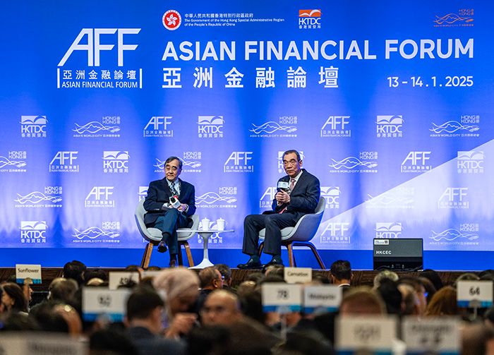 2025年1月13日,第18届亚洲金融论坛在香港会展中心开幕,前世界银行首席经济学家兼主管发展经济学的资深副行长林毅夫在专题午餐会发表主题演讲。图为林毅夫(右)在午餐会探讨环节回答提问。(图/中新社)