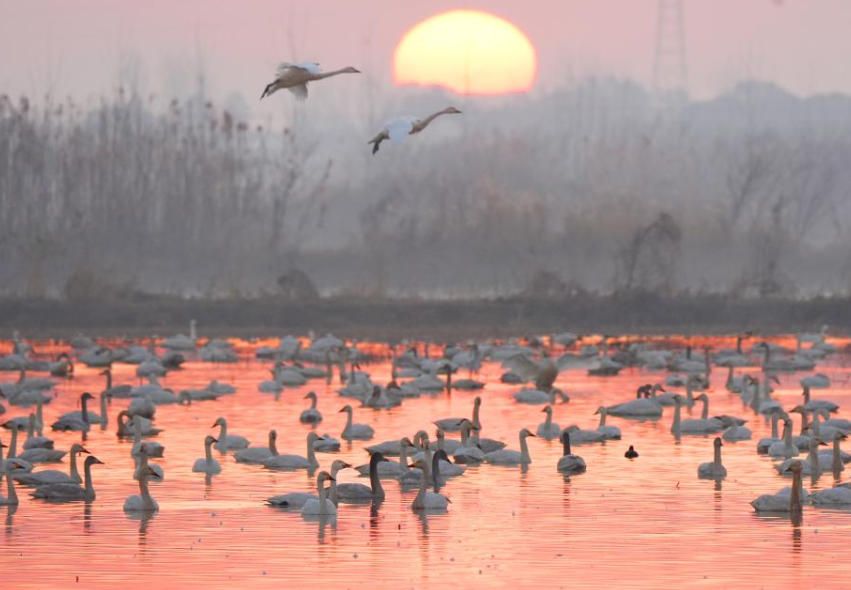 冬季,大批候鸟南迁越冬。它们或悠然游弋在湿地浅水中,或振翅翱翔在湿地上空,勾勒出一幅灵动和谐的生态画卷,成为当地冬日一道靓丽的风景线。