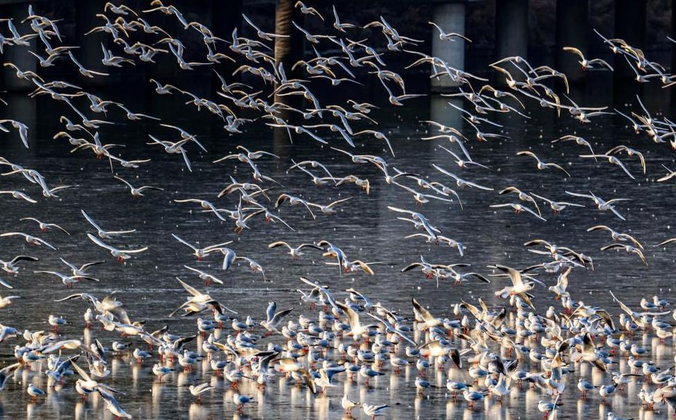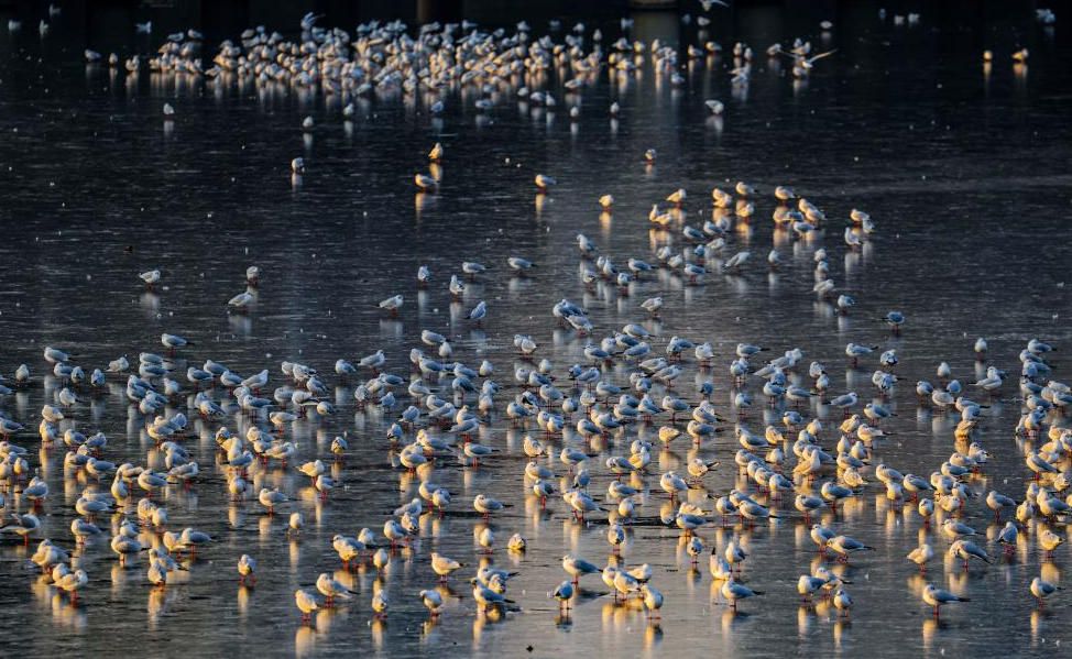 1月12日,山东省青岛市西海岸新区,岔河冰面上海鸥欢集舞翩跹。当地时间当日下午,上千只海鸥集聚在冰冻的河面上,它们时而静静休憩,时而翩跹起舞,一幕幕迷人的“冰上芭蕾” ,将冰河装点得灵动壮观。(中国央视网)