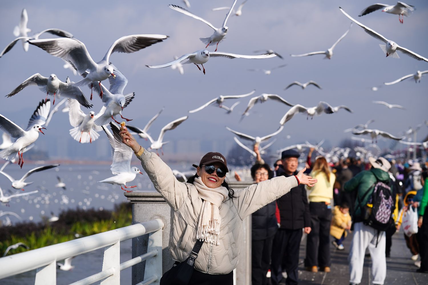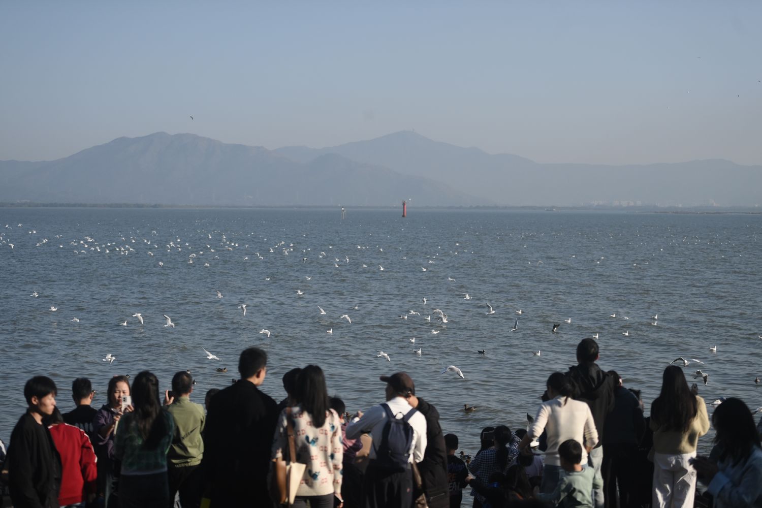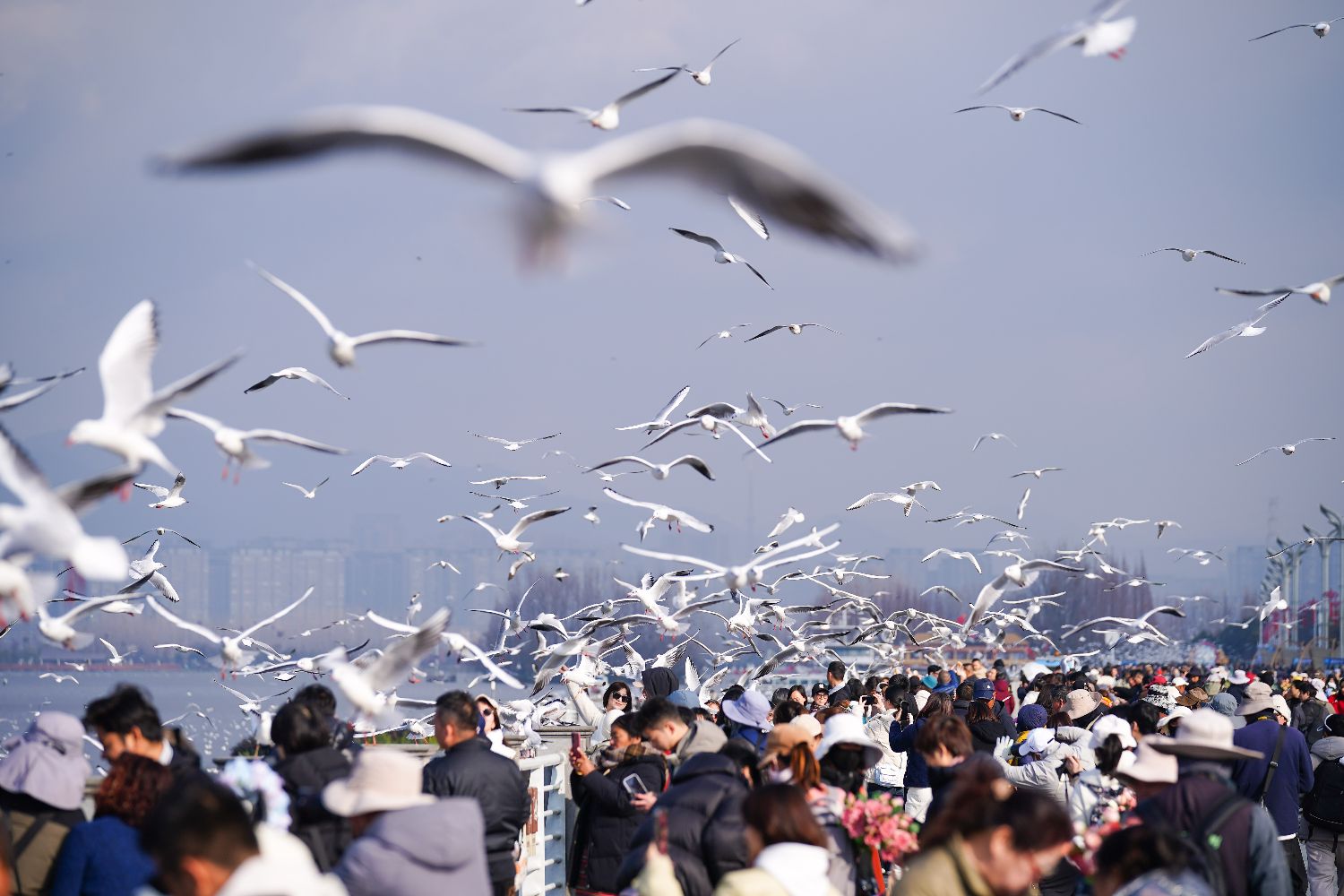 1月9日,昆明天气放晴、气温回升,不少市民和游客到滇池边观赏美景、投喂红嘴鸥。(中新社)