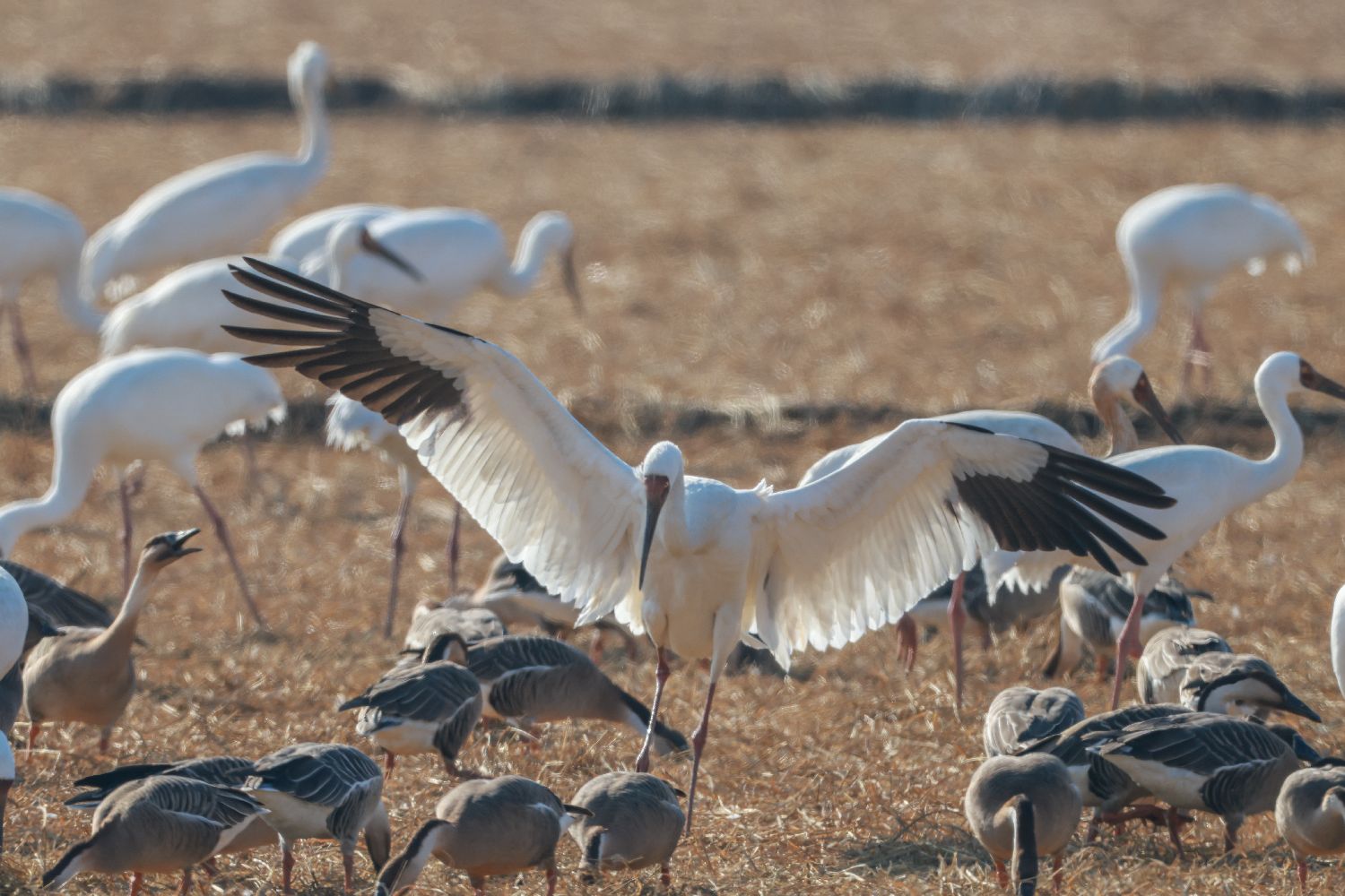 1月7日,江西上饶余干县,白鹤、白枕鹤、豆雁等候鸟聚集在鄱阳湖畔的康山垦殖场插旗洲分场越冬。鄱阳湖是中国最大淡水湖,也是全球候鸟重要栖息地、国际重要湿地。作为亚洲最大的候鸟越冬地,每年有数十万只候鸟来到鄱阳湖越冬,其中包括白鹤、白枕鹤、东方白鹳等珍稀候鸟。图为一只候鸟从空中降落到田野上。(中新社)