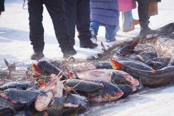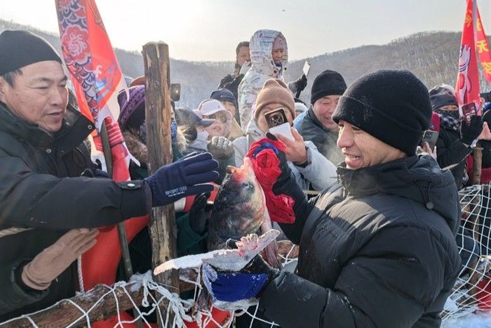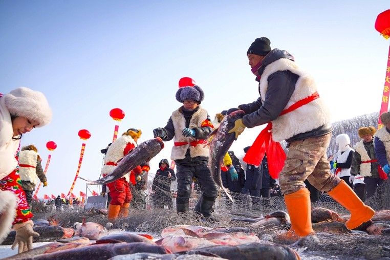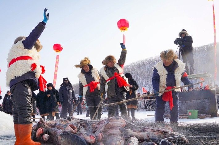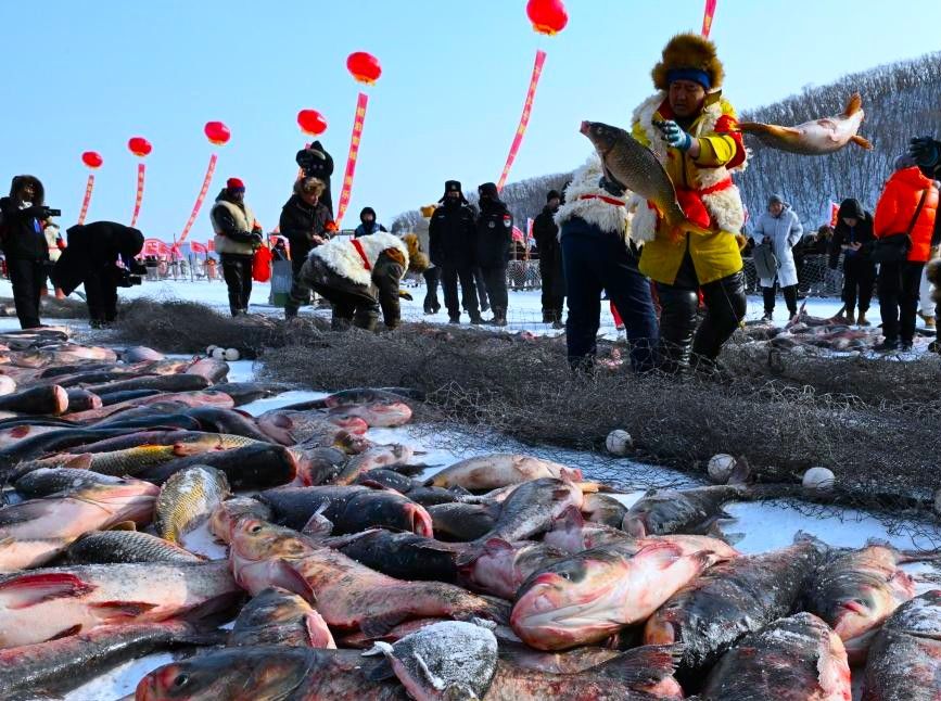 1月15日,中国·镜泊湖第十一届冬捕节暨冰超·牡丹江首届镜泊湖冬钓挑战赛启幕。千年大冬捕,一碗鱼米香。镜泊湖渔猎文化可追溯至唐朝时期,彼时渔民在凛冬凿冰捕鱼,“冰湖腾鱼”的盛况被载入史册。图为1月15日拍摄的冬捕节起网现场。(新华社)