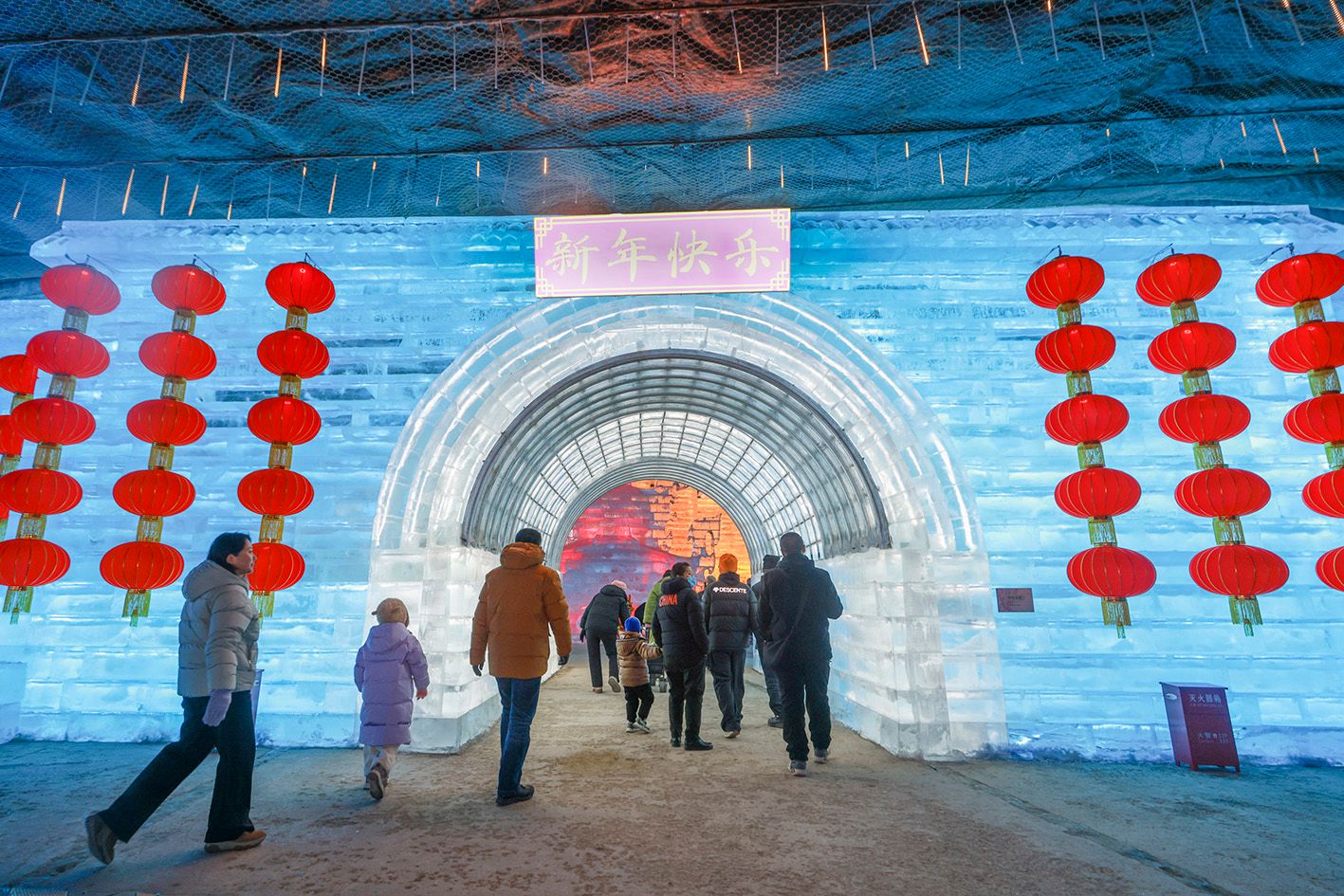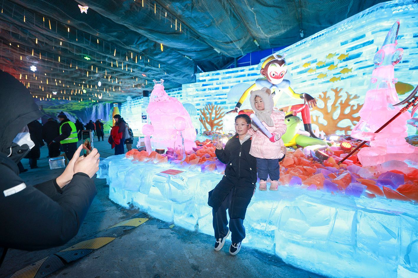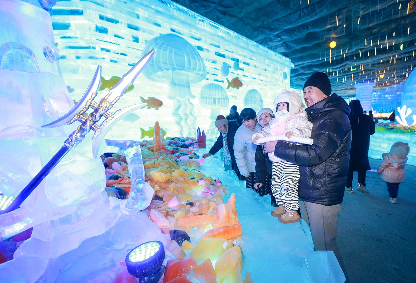 当地时间1月15日晚,北京延庆,第40届龙庆峡冰灯艺术节正式开幕。本届艺术节以“龙庆传奇·致敬经典”为主题,深情回望四十年冰雪文旅发展历程,更以中国国产动画经典《大闹天宫》IP为灵感打造奇幻冰境,为游客献上一场沉浸式冬日文旅盛宴。图为家长带着小朋友参观冰灯作品。(中新社)