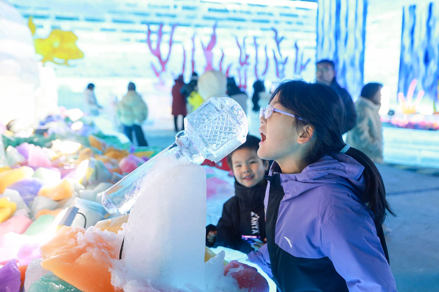 图为小朋友在冰雕的麦克风前唱歌。(中新社)