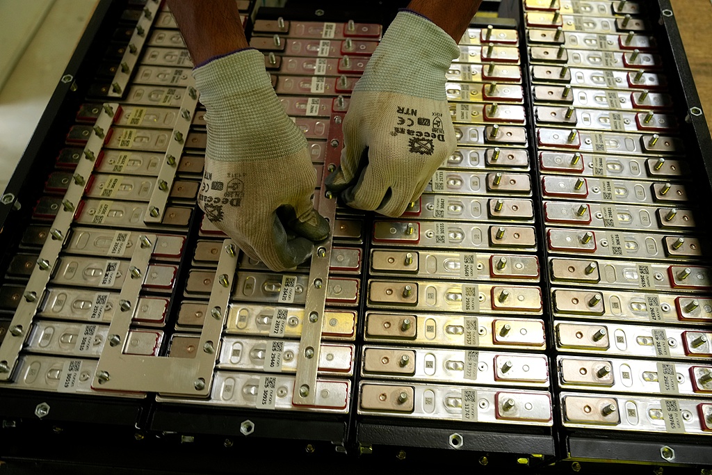 位于印度班加罗尔的一家工厂内,电池生产工程师在组装由废旧电动汽车电池制成的翻新电池组。(视觉中国)