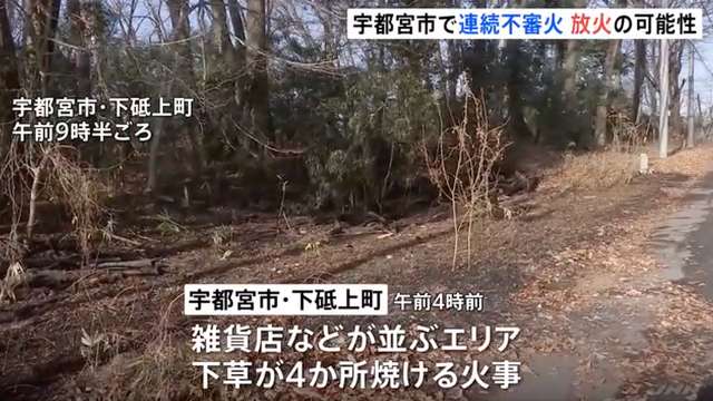 报道称,最早一起火灾发生在凌晨4时前,地点位于栃木县宇都宫市下砥上町。该区域杂货店和住宅较为集中,现场共有4处路边杂草被烧毁。火势虽不大,但起火点分散,引发周边居民不安。