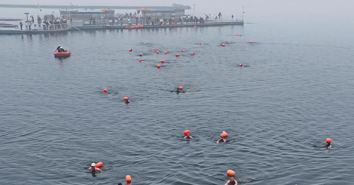当地时间当日9时,比赛正式开始,随着发令枪响,“泳士”们纵身跃入湖水。选手们或侧泳疾驰,或蛙泳稳进,凛冽寒风丝毫未减他们的竞逐热情。岸边观众们的呐喊声、助威声此起彼伏。