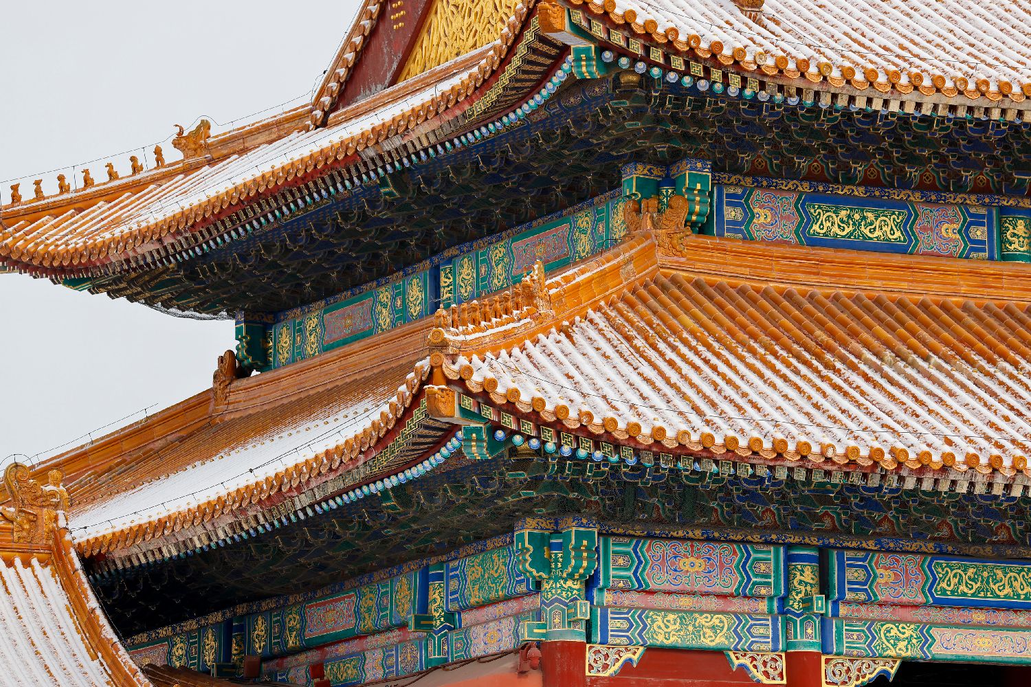 2026年1月18日,故宫建筑的琉璃瓦上覆盖着白雪。近日,北京迎来了2026年的首场降雪天气。一夜之间,古老的紫禁城被覆盖上一层厚厚的白雪。洁白的雪与朱红的宫墙、金黄的琉璃瓦相互映衬,勾勒出一幅美轮美奂的画卷。(王亚霓 摄)