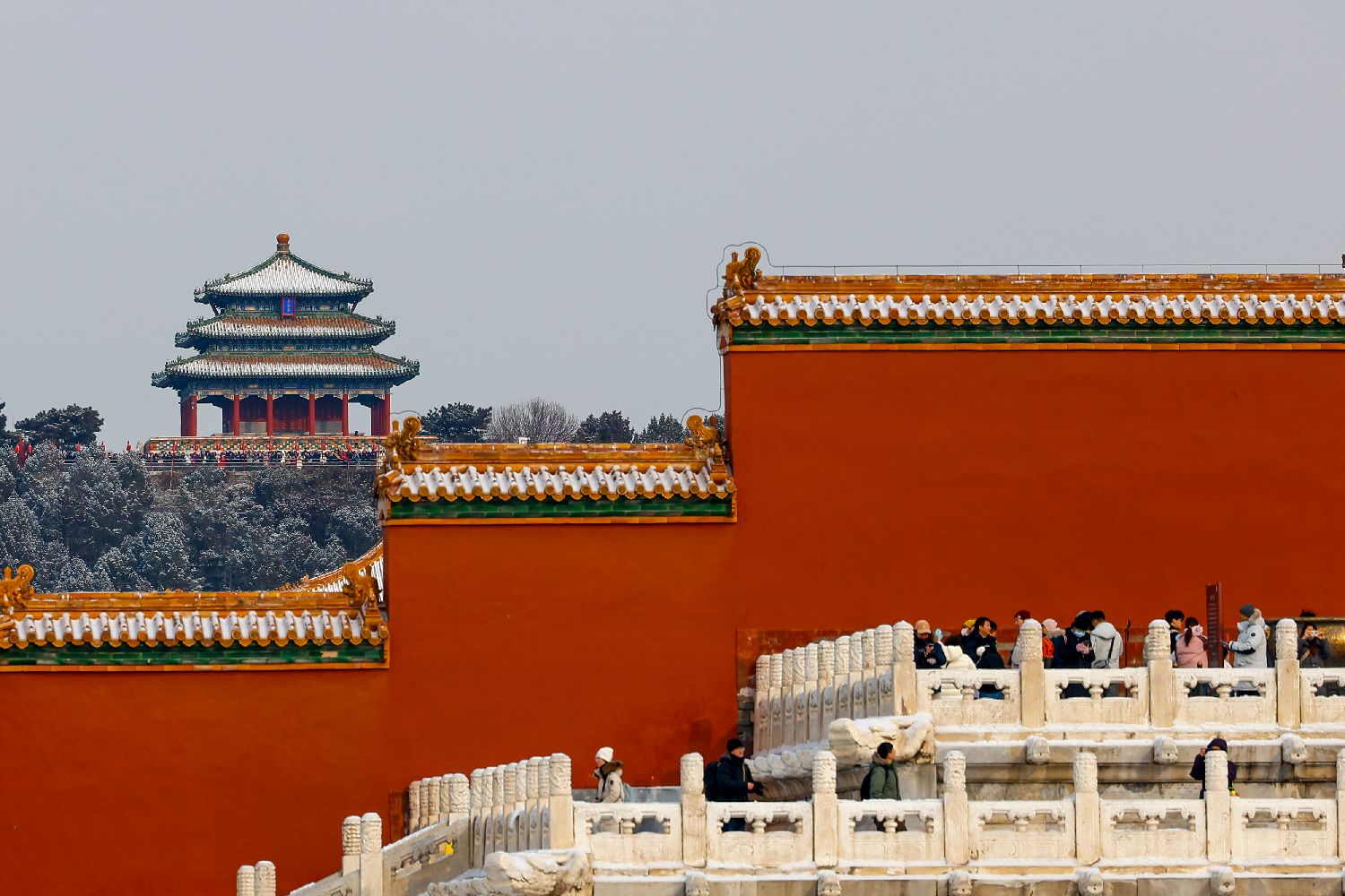 2026年1月18日,故宫红墙映衬着被积雪覆盖的景山公园万春亭。(王亚霓 摄)