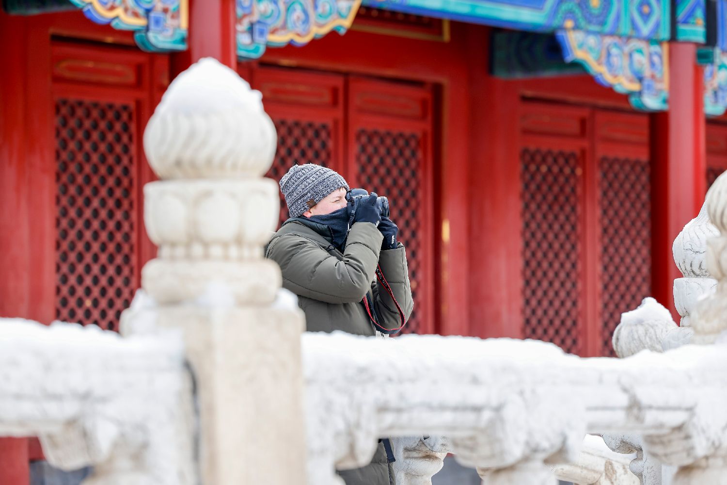 2026年1月18日,外籍游客在故宫内拍摄雪景。(王亚霓 摄)
