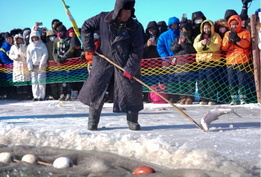 1月8日,查干湖上,人工凿冰、马拉绞盘、冰下走网等渔猎技艺有序展开。(图/新华社)