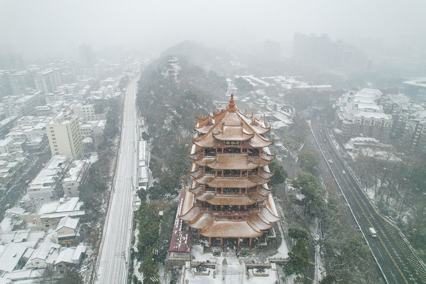1月20日,航拍雪中的黄鹤楼。当地时间19日夜间至20日,武汉迎来2026年首场降雪。(中新社)