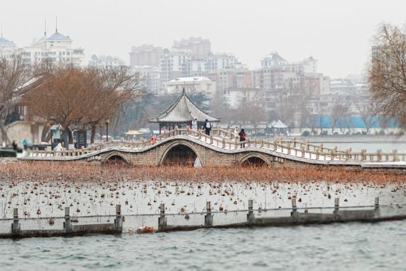1月19日,游客在山东省济南市雪中的大明湖景区打卡。(中新社)