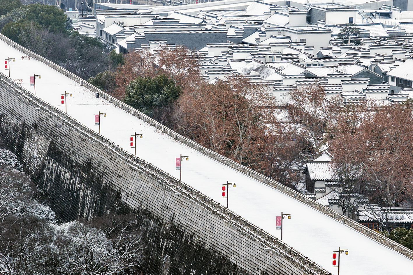 1月20日,雪落南京“扮靓”古城。图为航拍雪后的明城墙与民居。(中新社)
