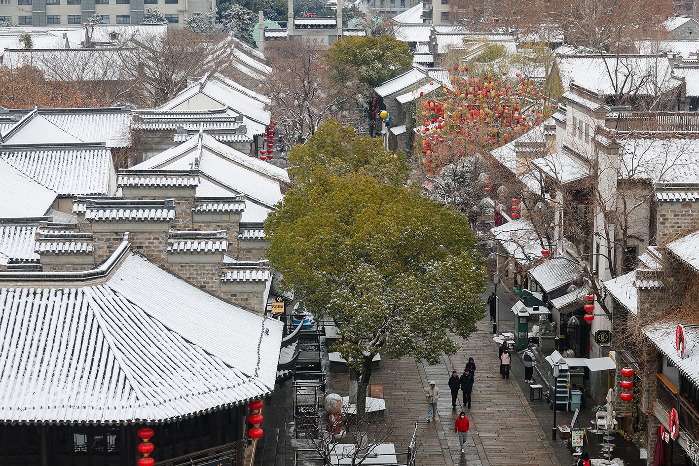 1月20日,雪落南京“扮靓”古城。图为民众在雪后的城南老街上游玩。(中新社)